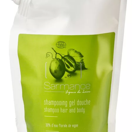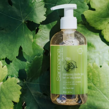 Enrichi en eau de vigne de Loire certifiée bio (vitis vinifera), le shampooing douche bio Sarmance nettoie en douceur cheveux et corps avec un parfum naturel.